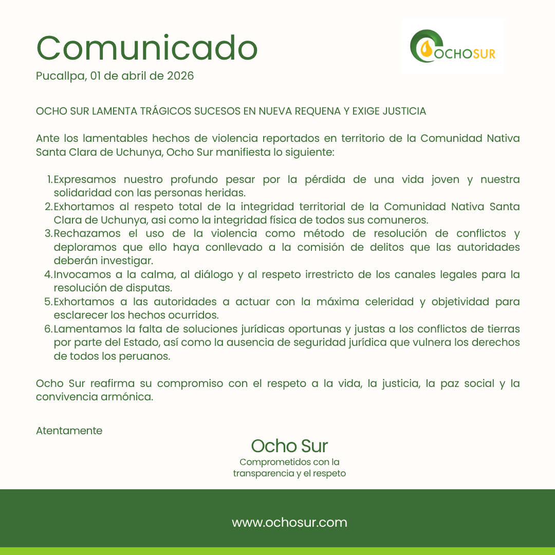 Ante los lamentables hechos de violencia reportados en territorio de la Comunidad Nativa Santa Clara de Uchunya, Ocho Sur manifiesta lo siguiente: