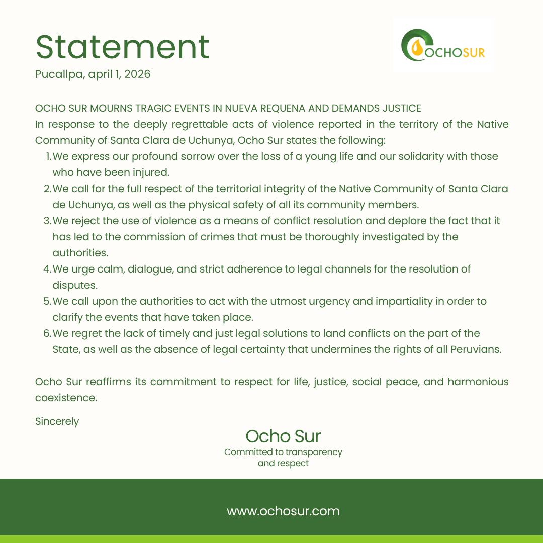 In response to the deeply regrettable acts of violence reported in the territory of the Native Community of Santa Clara de Uchunya, Ocho Sur states the following:
